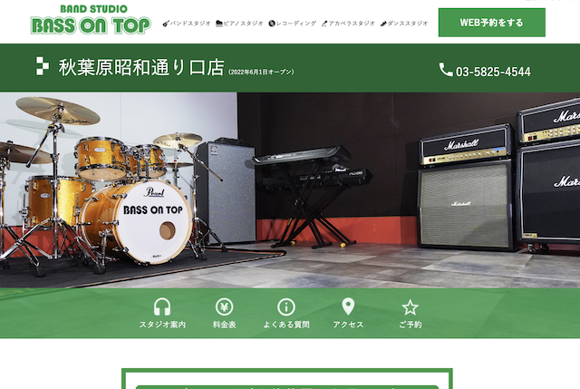 | バンドスタジオBASS ON TOP | ★★★★☆ | リハーサル | 660円~ | 1350円~ | 10:00~翌朝5:00 | なし | TEL/WEB | 各線秋葉原駅昭和通り口から徒歩2分 |