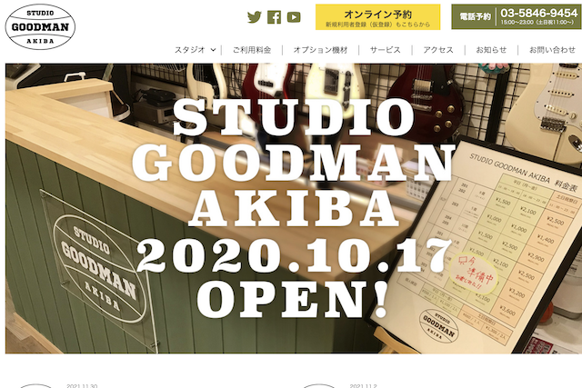 | スタジオグッドマンアキバ | ★★★★☆ | リハーサル | 550円~ | 1000円~ | 15:00~23:00 | なし | TEL/WEB | JR秋葉原駅昭和通り口から徒歩5分 |