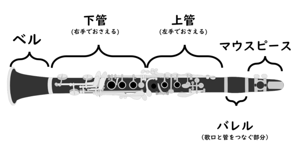 クラリネットは、「マウスピース」「バレル」「上管」「下管」「ベル」の5つのパーツから成ります。