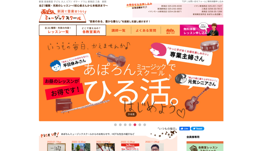 あぽろんミュージックスクールは、さまざまなギターコースや、ボーカルコース、複数の管楽器コースなど合計21コースから選べる音楽スクールです。