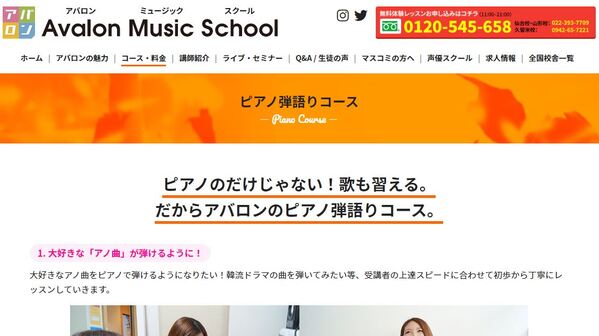 アバロンミュージックスクールはボイストレーニングに力を入れている音楽教室で、ピアノのコースでは弾き語りを習うことができます。