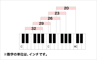 上の表がインチごとに出せる音域です。演奏する曲と照らしあわせて見てみましょう。