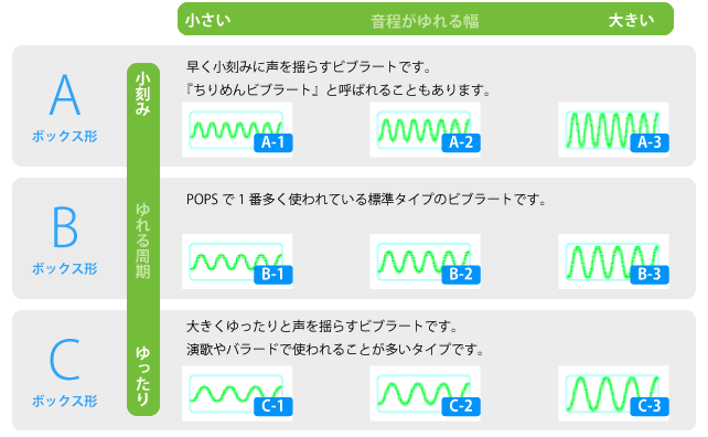 文字にすると難しく見えますが、ビブラートの波の細かさで分けてると認識するとわかりやすいです。