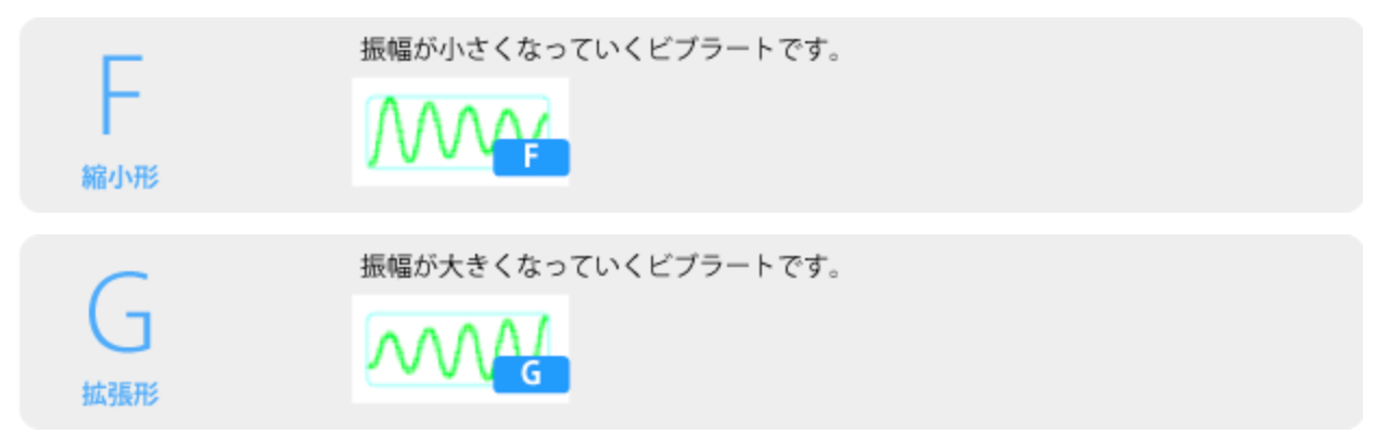 縮小形と拡張形は、揺れの幅が徐々に小さくなったり大きくなったりするビブラートのことを指します。