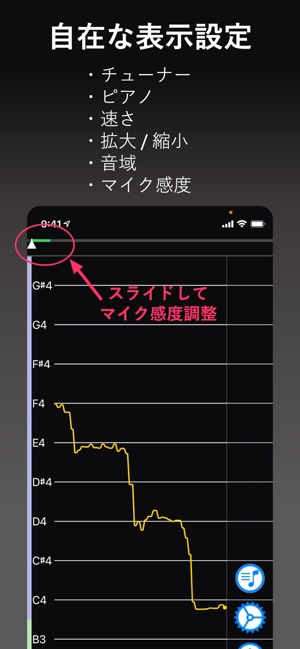 「音程チューナー」は、出している音をリアルタイムで解析して音階、音域、周波数、音高、波形を確認することができます。