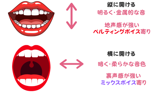 具体的には、口を横に広げて口角を上げた状態で発声すると、地声感の強いベルティングボイスになり、口を縦に広げると柔らかいミックスボイスに近い声になります。