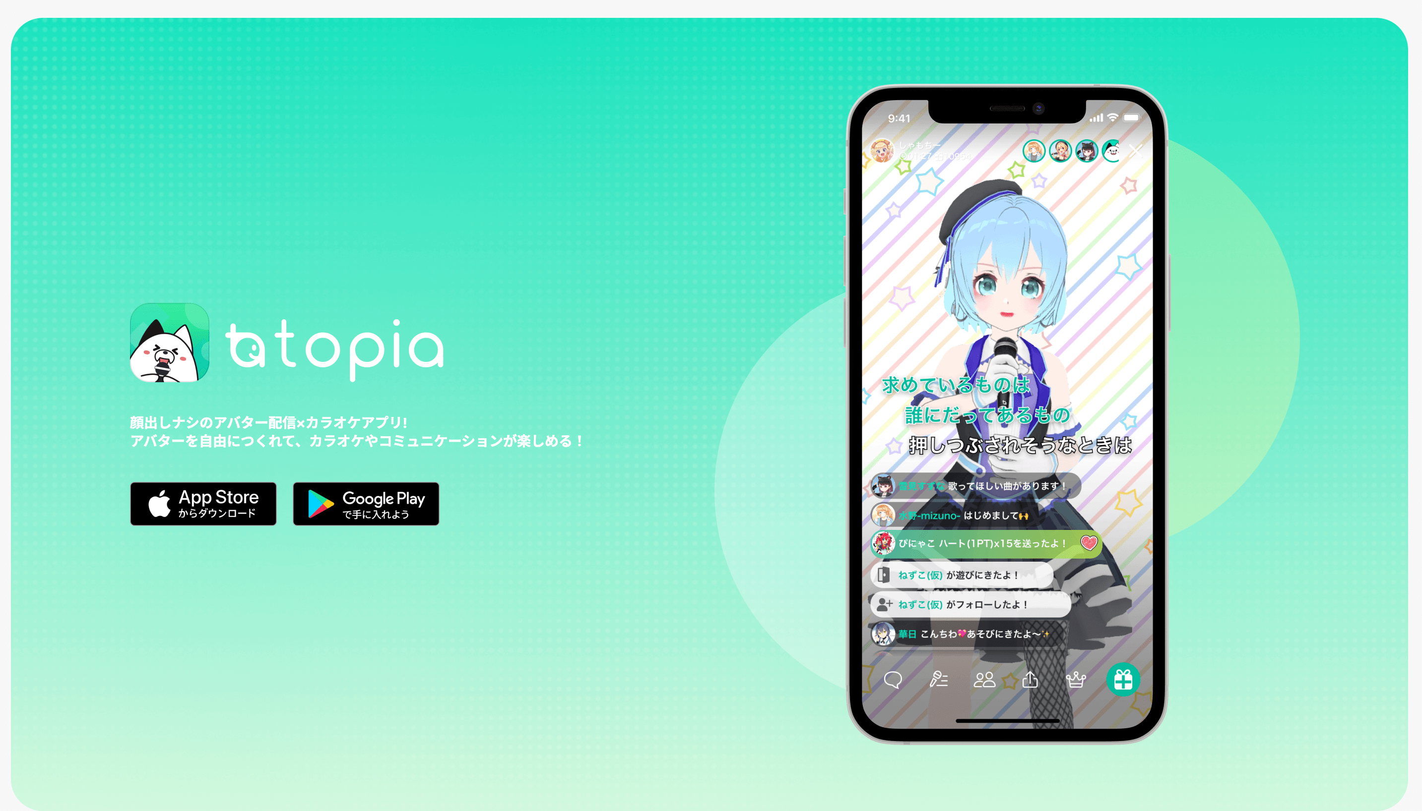 トピアは、アバターを作成し自分だけのオリジナルキャラクターでカラオケライブ配信を楽しめるアプリです。