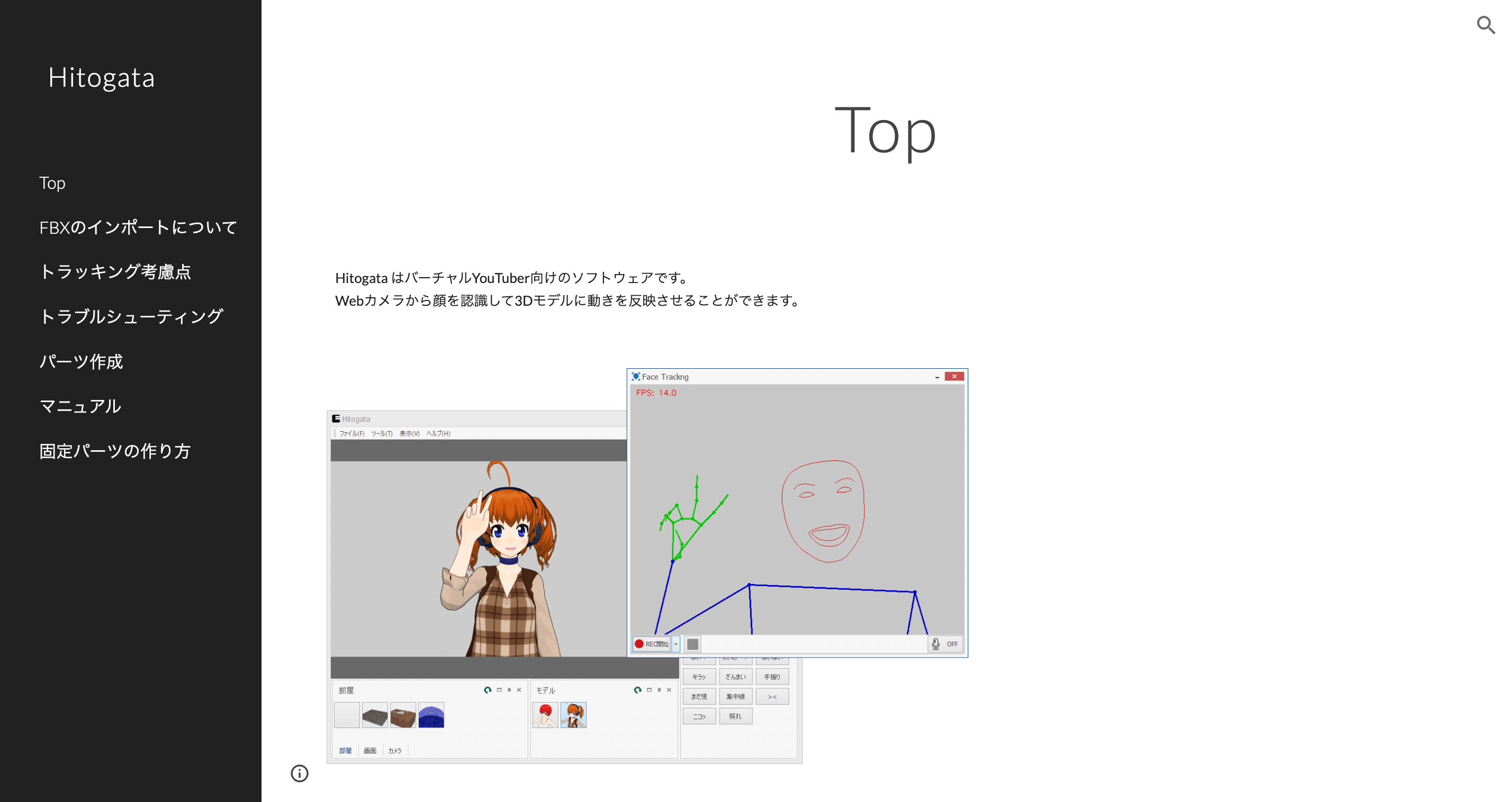 Hitogataは、オリジナルキャラクターを制作できるだけでなく、Webカメラに映る顔のパーツや上半身、腕や指など細やかな部分にまでトラッキングできるソフトです。