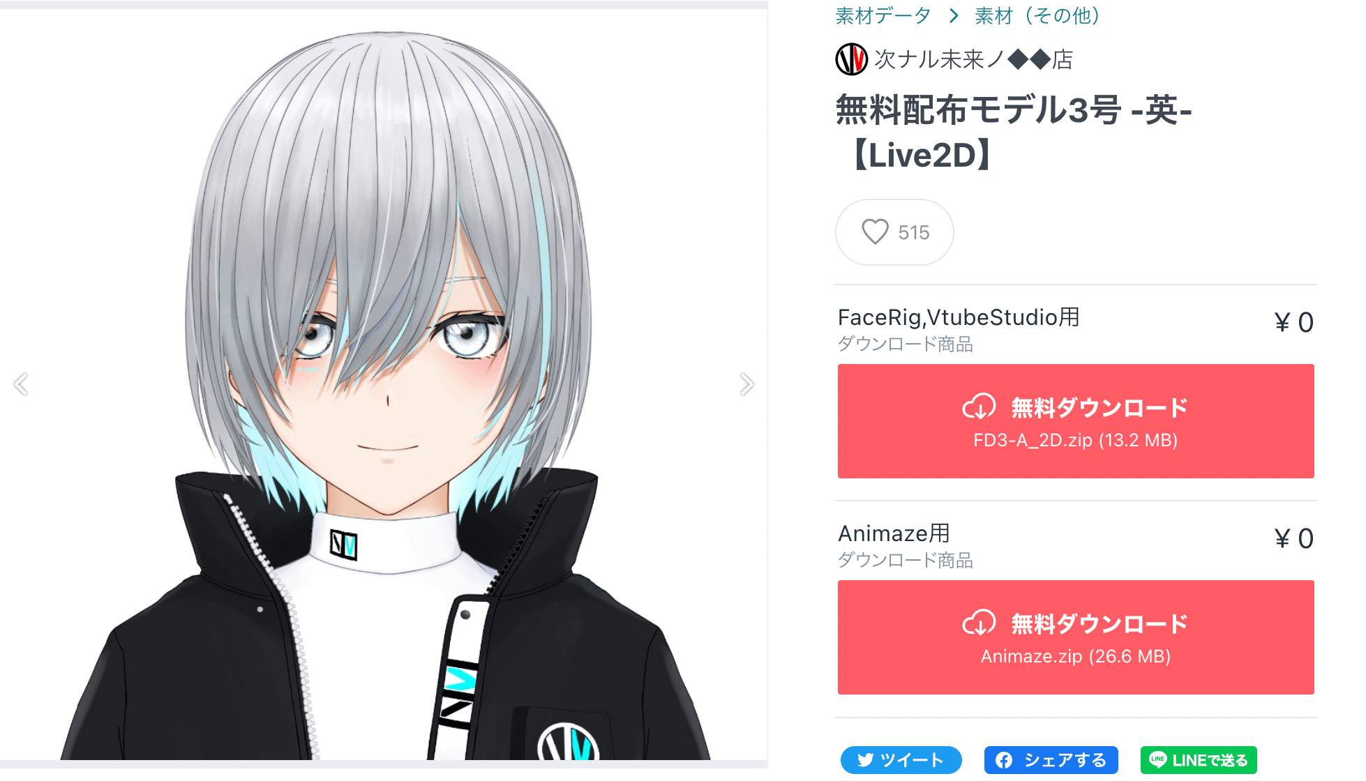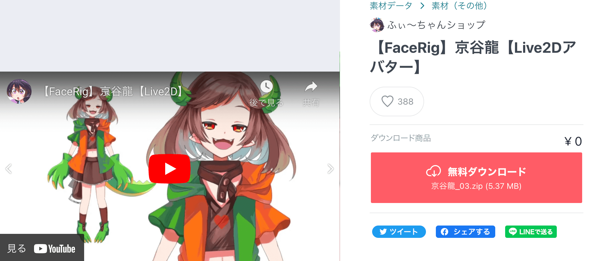 ふぃ〜ちゃんショップさんが制作した京谷龍は、BOOTHにて無料ダウンロードが可能なFaceRig専用Live2Dアバターです。