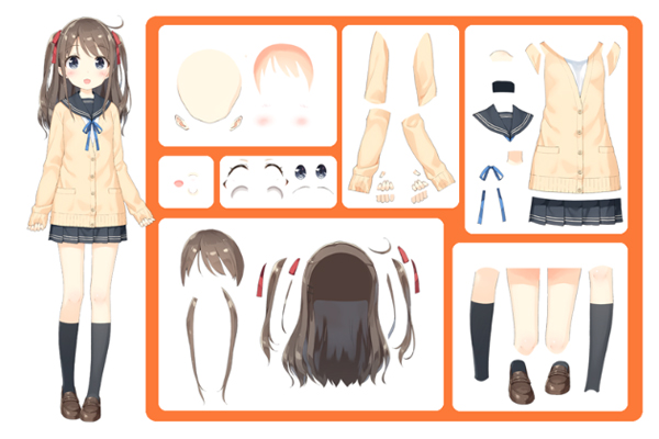 Live2Dの場合、平面なイラストを動かすので、正面を向いたキャラクターとパーツが必要となります。