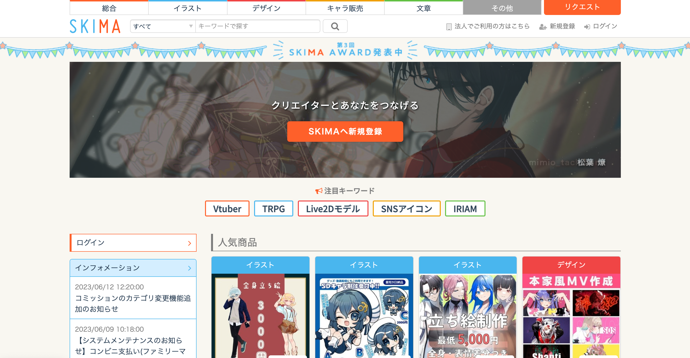 SKIMAは、Live2Dだけでなく3Dモデルの制作を担当してくれるクリエイターも探せるサイトです。