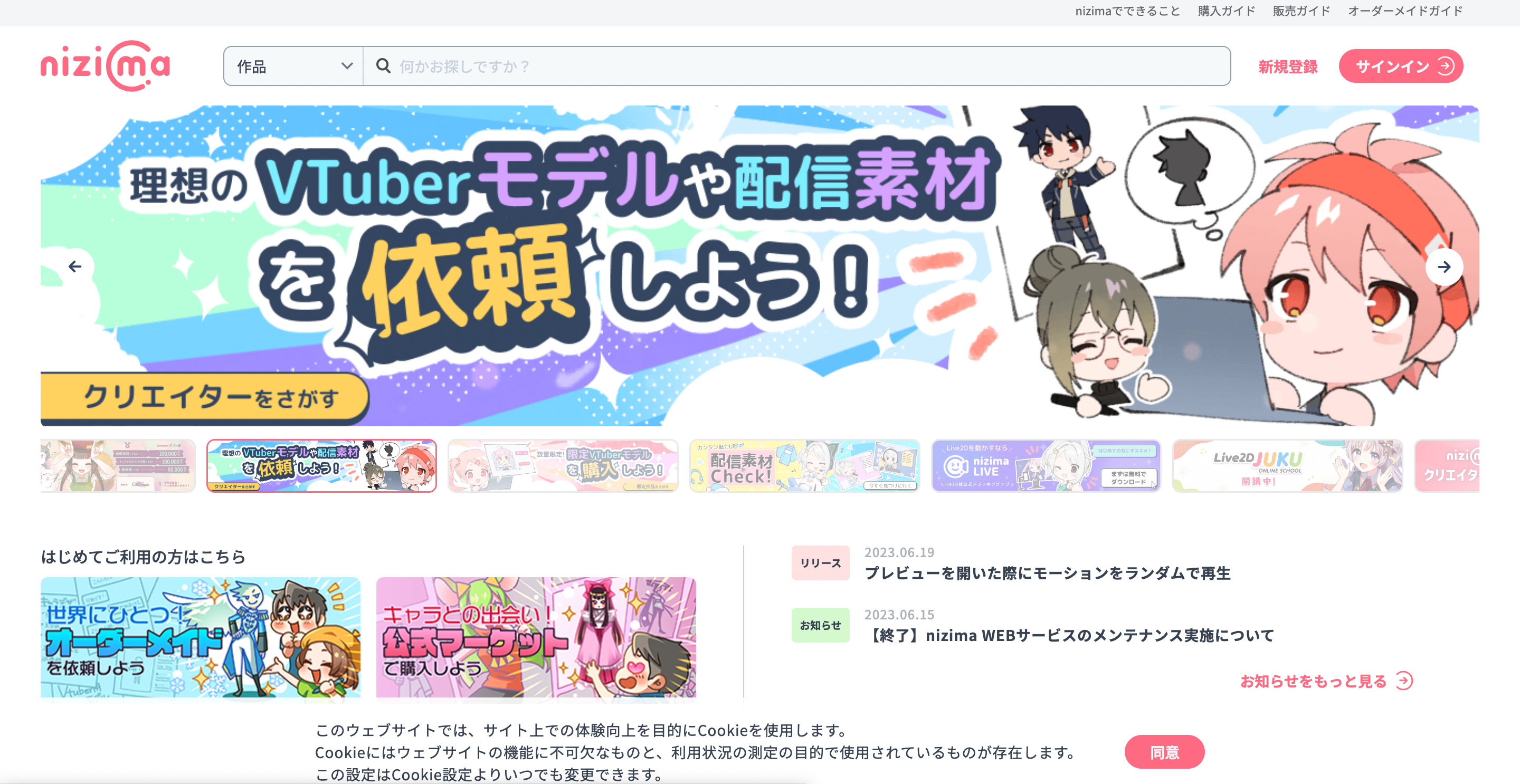 nizimaは、VTuberのモデル販売や依頼ができる、VTuber界隈では有名なサイトです。