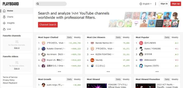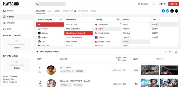 特定のVTuberやYouTuberのスパチャ集計金額は、PLAYBOARDの「Most Super Chatted」で確認できます。