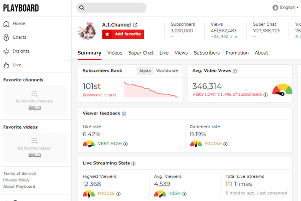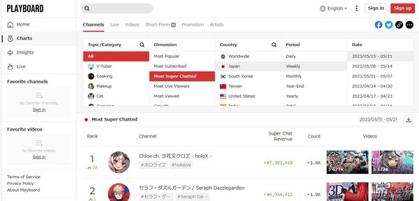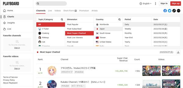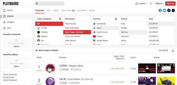 スパチャの集計金額はPLAYBOARDで公表されているので、どのVTuberがいくらスパチャで稼いだか調べることも可能です。